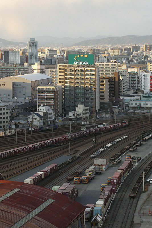 JR西日本 梅田貨物線 梅田 2013.01.26 JR西日本 東海道本線 2024年03月28日 大阪駅の屋上から眺めた梅田貨物駅の景色。 梅田貨物駅は廃止される直前の頃ですが、 まだたくさんの線路や、プラットホームの屋根が残っていて活気がありました。 グランフロント大阪も、開業前の最後の仕上げ工事中でした。 (2013.01.26/梅田)