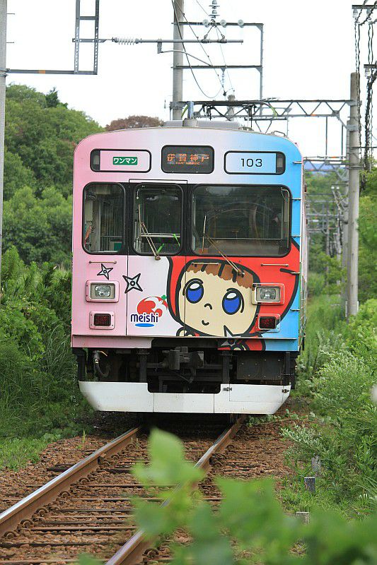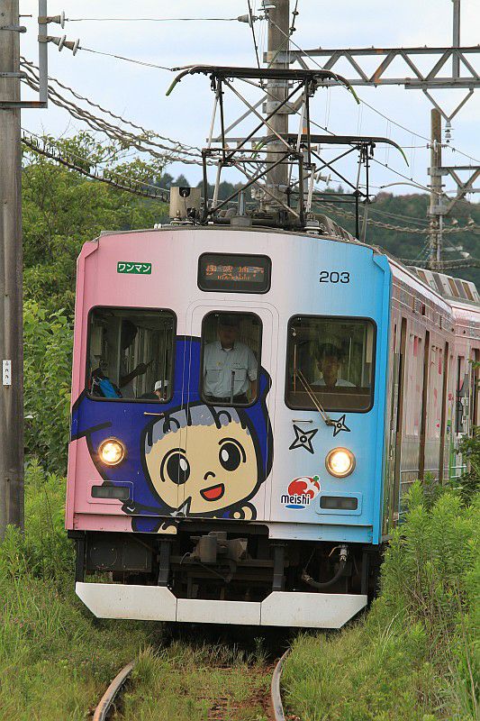 伊賀鉄道 伊賀線 上林-比土 2017.08.14 200系名泗コンサルタントラッピング 近畿日本鉄道 2025年08月28日 伊賀鉄道の200系。 松本零士デザインとは違った、かわいらしい忍者のイラストのラッピング編成が走っていました。 (2017.08.14/上林-比土)