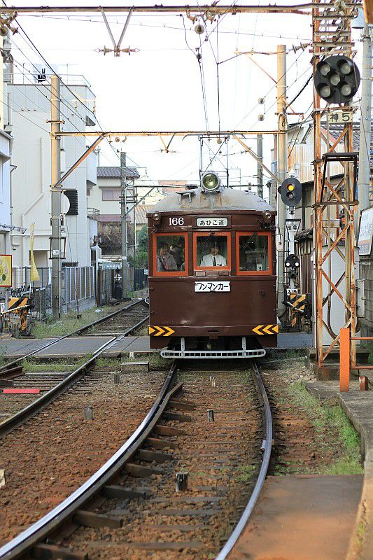 阪堺 上町線 住吉 2017.03.19 モ166 南海電鉄 2025年05月02日 阪堺線のモ161形166号。 昔の電車風の茶色の塗装で走っていました。 現在は色も変わっているようですが、故障のため旧車状態となっているそうです。 (2017.03.19/住吉)