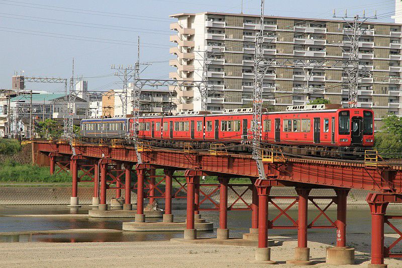 南海 高野線 我孫子前-浅香山 2017.05.02 真田赤備え列車 南海電鉄 2025年06月05日 大和川の鉄橋を渡る2000系「真田赤備え列車」。 真田幸村をイメージしたラッピング編成が走っていました。 (2017.05.02/我孫子前-浅香山)