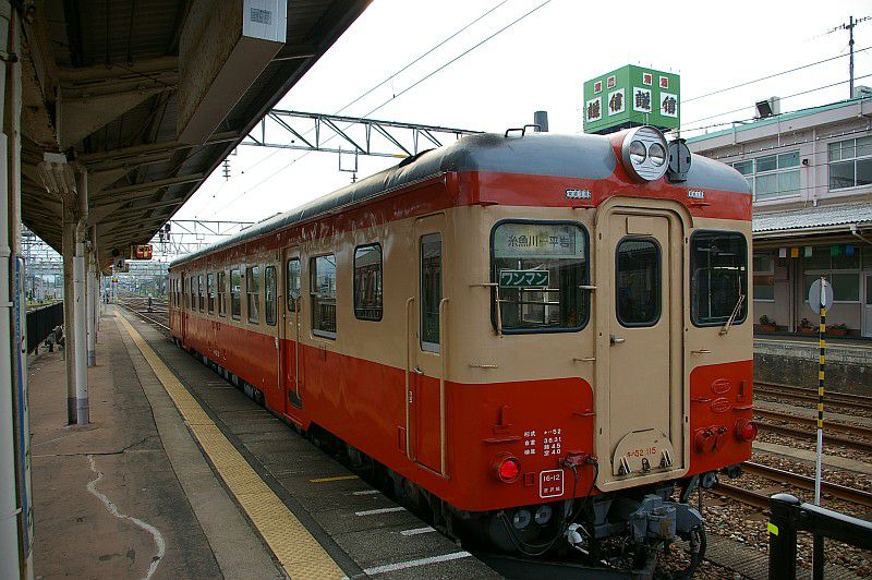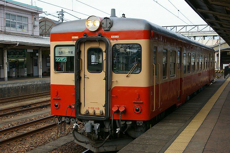 JR西日本 大糸線 糸魚川 2008.08.13 キハ52系 JR西日本 大糸線 2023年04月02日 糸魚川駅に停車中の大糸線キハ52系。 レトロな気動車がまだ現役で走っていました。 正面の顔も、ドア付近の側面も、いかにもレトロな感じの車両でした。 (2008.08.13/糸魚川) 糸魚川といえばレンガ車庫でした。 レンガ車庫には色違いのキハ52系もいました。 新幹線の工事が始まる前の現役の頃の風景です。(2008.08.13/糸魚川) 糸魚川の旧駅舎。 新幹線開業で駅の風景も大きく変わっているはずです。(2008.08.13/糸魚川) PR