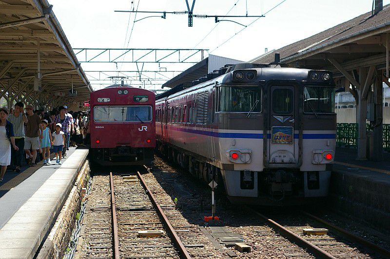 JR西日本 播但線 寺前 2010.08.28 キハ40系 JR西日本 播但線 2023年12月14日 寺前駅で並んだキハ40系と103系。(2010.08.28/寺前) 和田山駅で並んだキハ41形。 独特の切妻顔のキハ41形が並んでいました。(2010.08.28/和田山) 和田山駅にあった展示物。 キハ189系デビューに向けた展示物だったようです。 DD51とキハ40と113系の組み合わせが味があります。(2010.08.28/和田山)