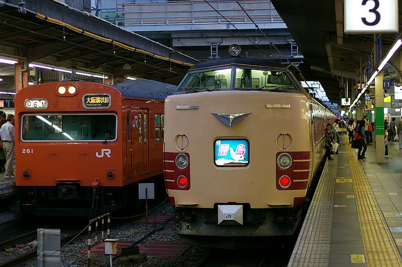 大阪環状線の103系と、金沢から到着した「雷鳥」。(2009.05.05/大阪)