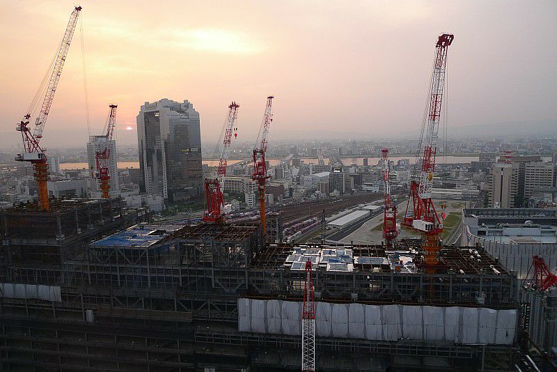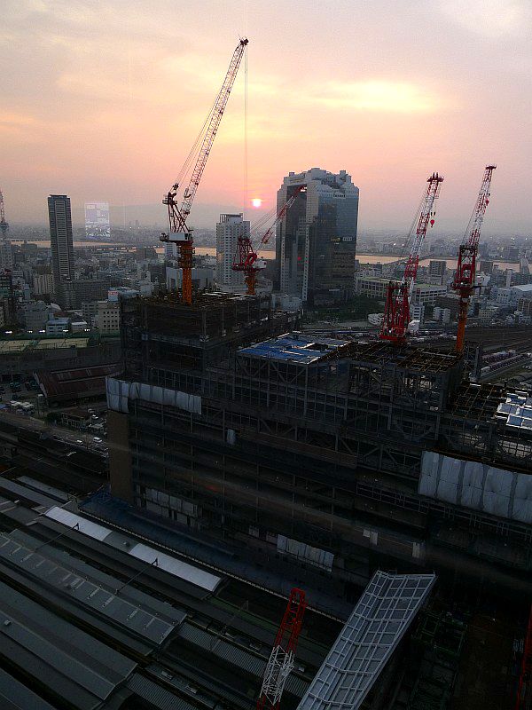 後ろで工事中の巨大な建物は大阪駅の北ビルで、