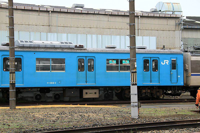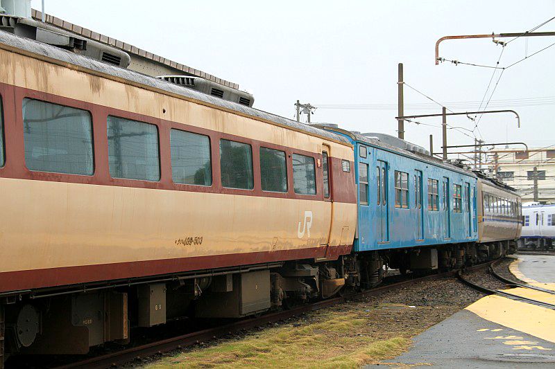 JR西日本 東海道本線 吹田工場 2011.10.05 489系ボンネット車 JR西日本 東海道本線 2024年02月13日 吹田工場の見学会で展示されていた489系ボンネット車。 金沢で急行能登に使われていたクハ489-503です。 状態も悪かったので、展示というよりも解体待ちだったのかもしれないです。 (2011.10.05/吹田工場) さらに後ろには103系と183系も連結されている不思議な状態でした。 (2011.10.05/吹田工場) 水色の103系は、トップナンバーのクハ103-1で、 現在は京都鉄道博物館に展示されている車両です。(2011.10.05/吹田工場)
