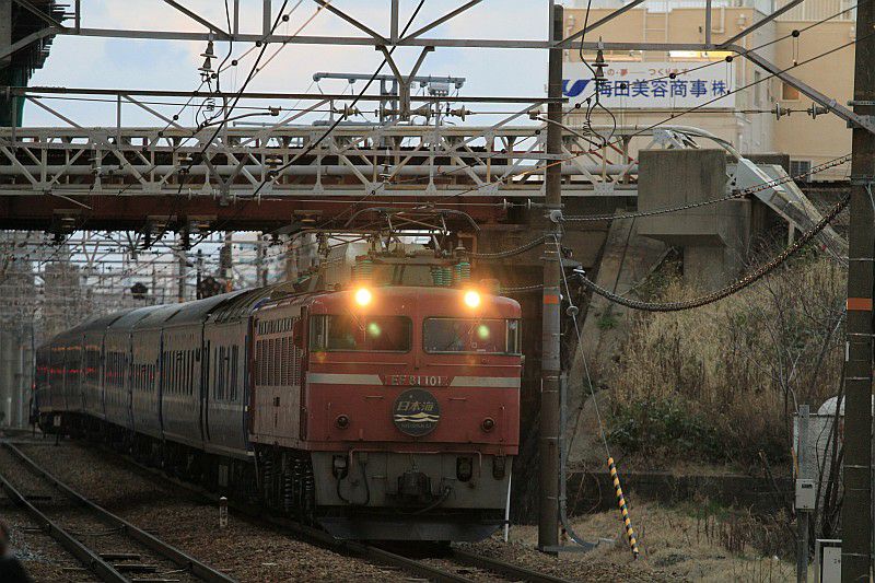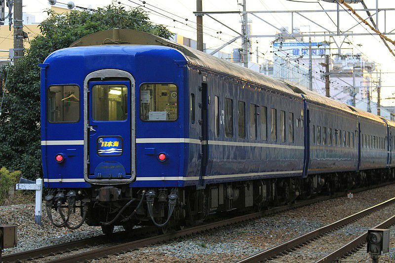 JR西日本 東海道本線 宮原操車場 2012.03.10 EF81日本海 JR西日本 東海道本線 2024年02月21日 宮原操車場を出発して大阪駅へ向かうEF81+24系「日本海」。 夕方の時間帯に出発していたため、比較的明るい時間に見れていました。 (2012.03.10/宮原操車場) 大阪駅を出発して青森に向かう「日本海」。 宮原操車場で見送った後、車で淀川まで先回りすると、 もう一度見ることができていました。(2012.03.10/新大阪-大阪)