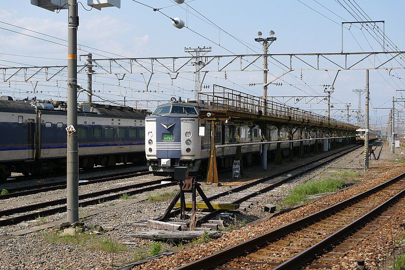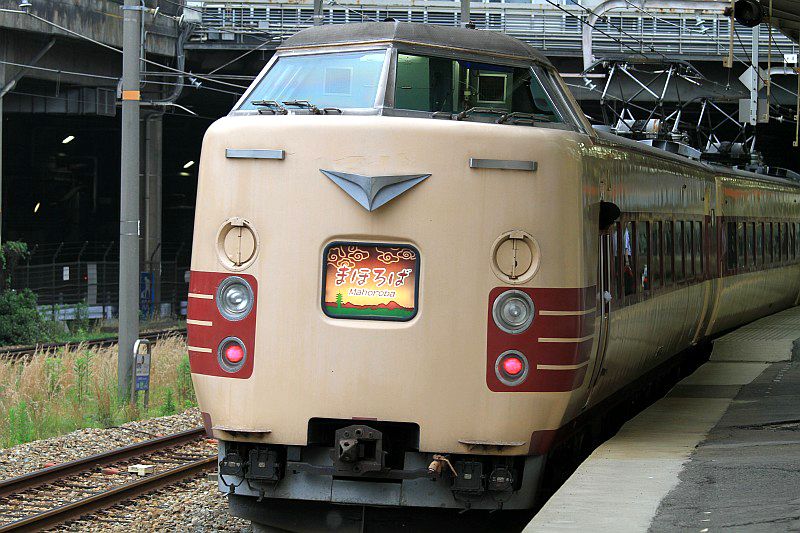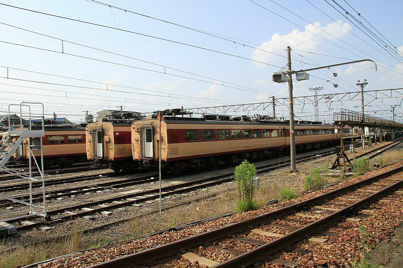 485系と381系の国鉄型先頭車の並び。