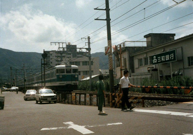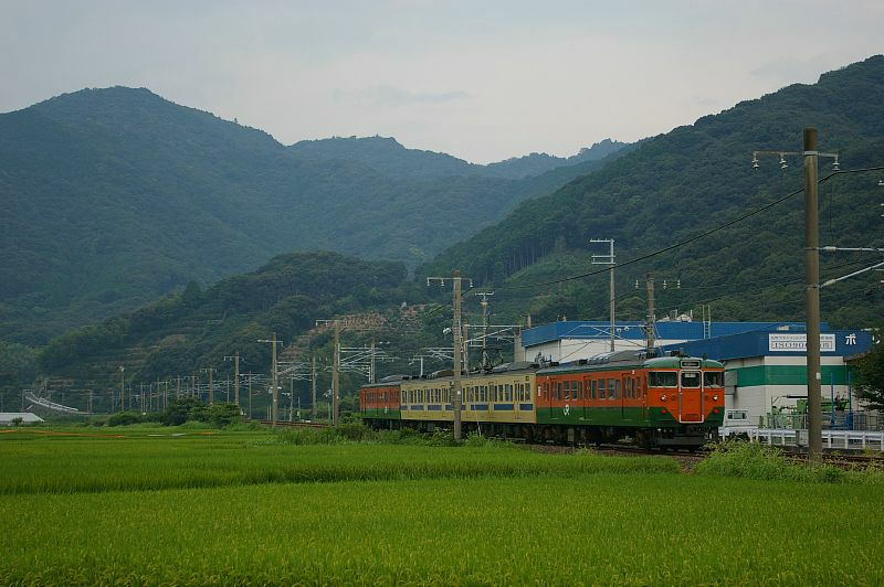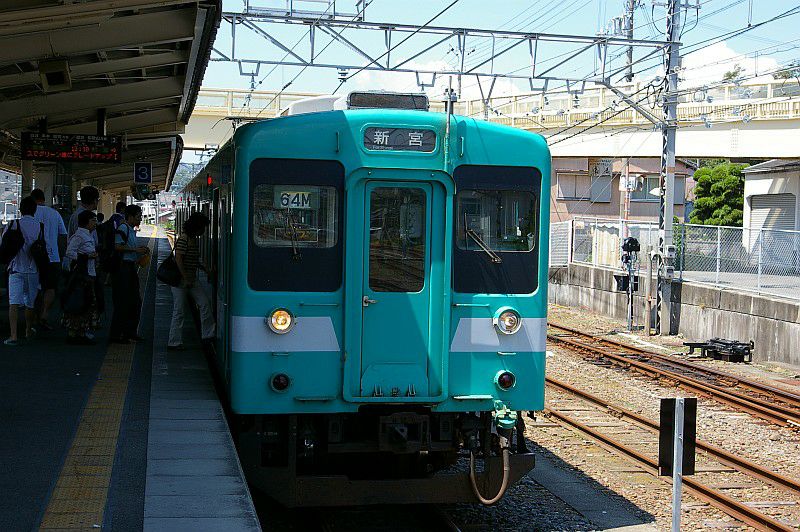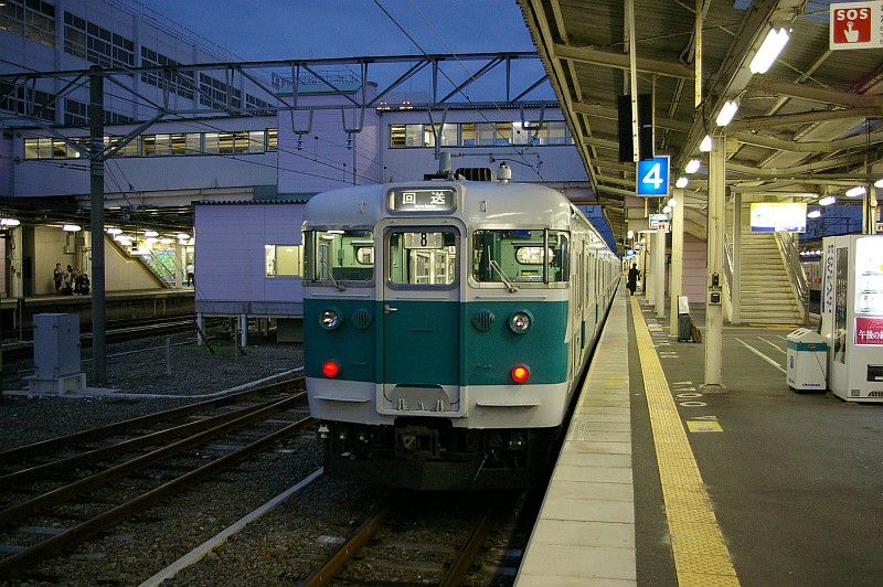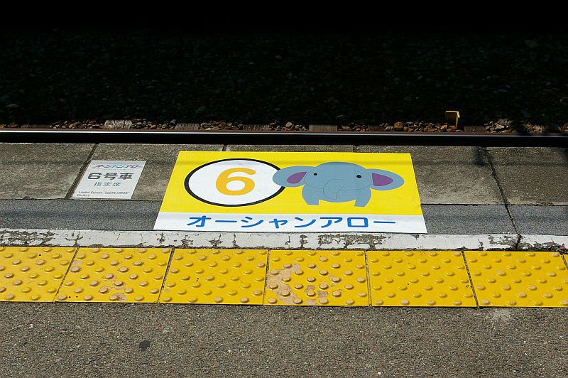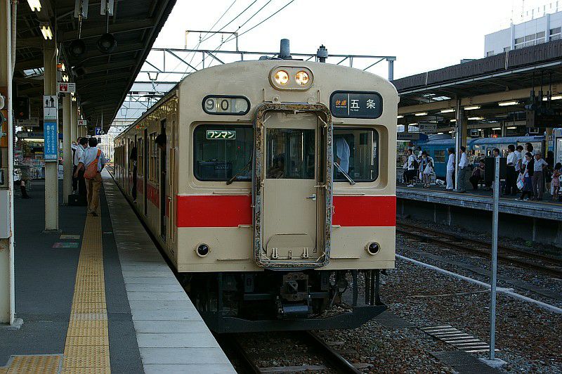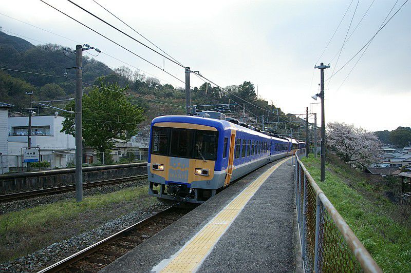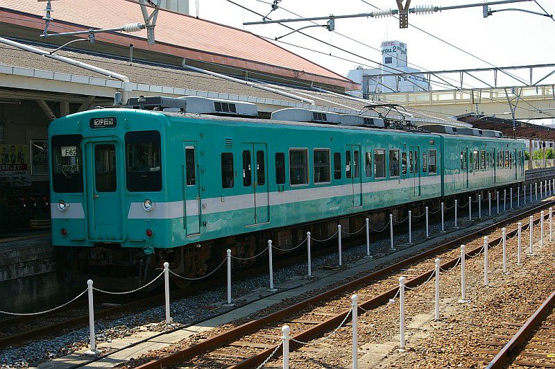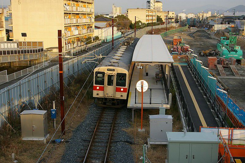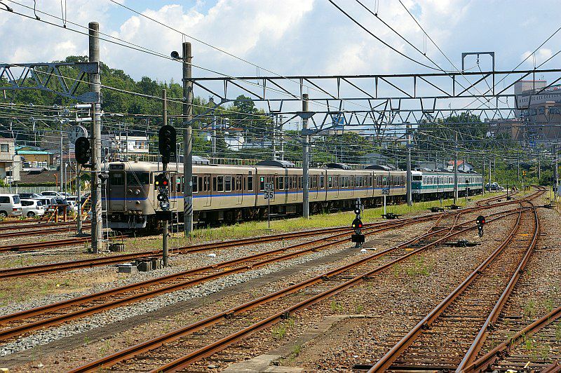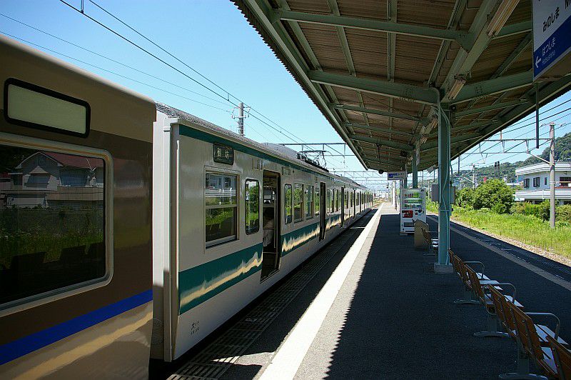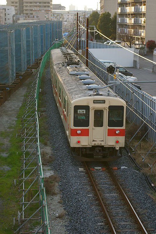貫通路を封鎖された中間車が本線上に留置されているという、ちょっとシュールな姿です。